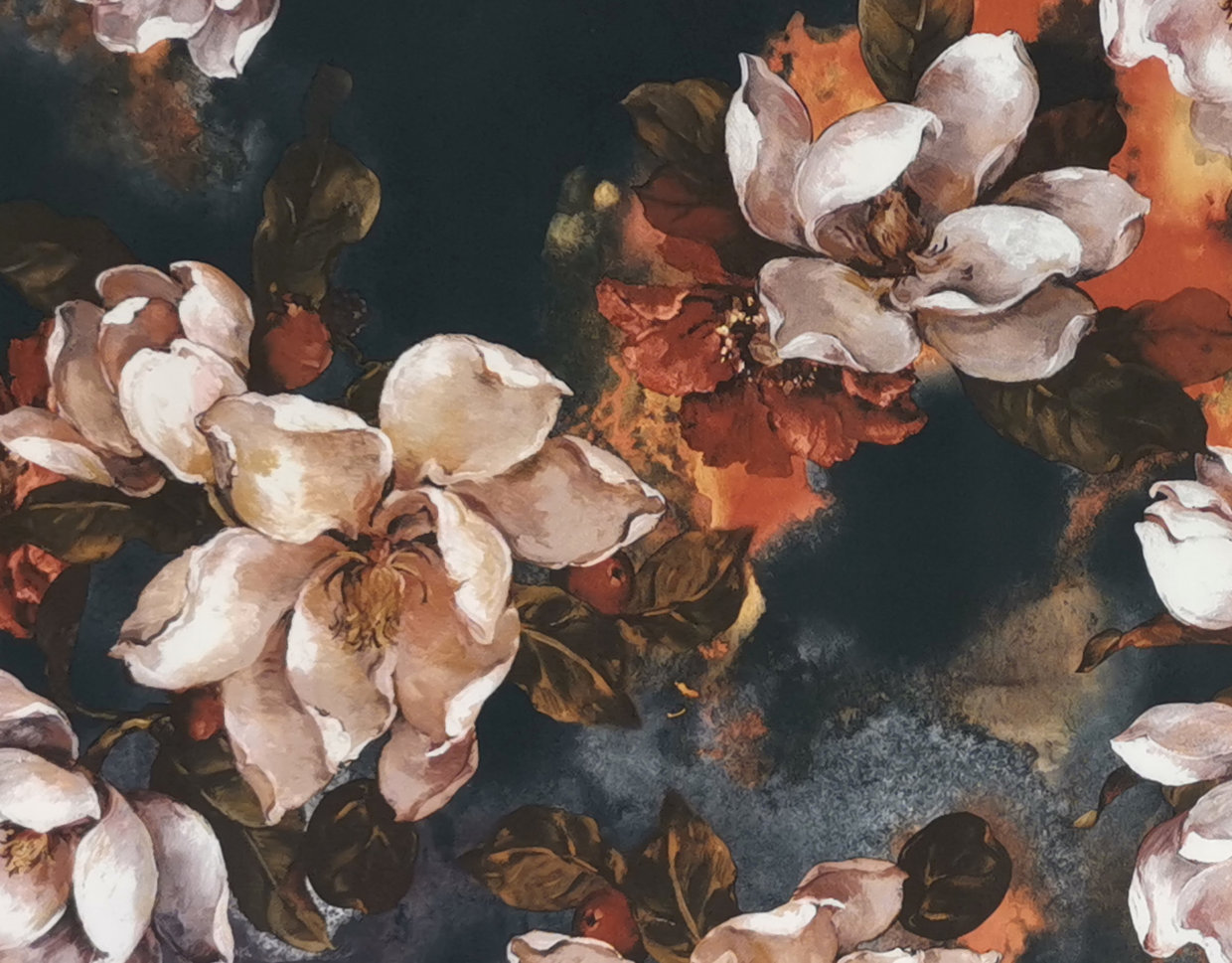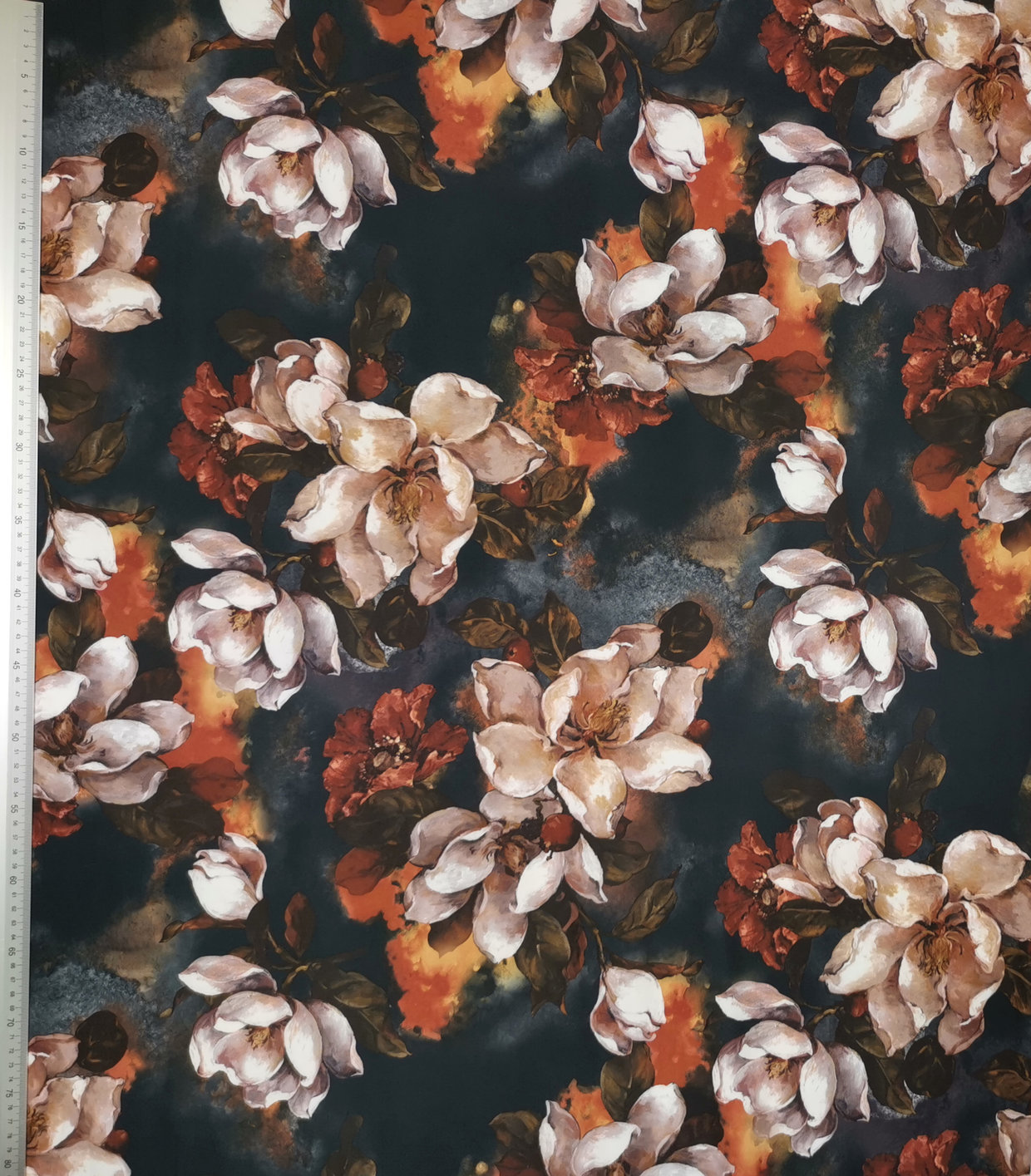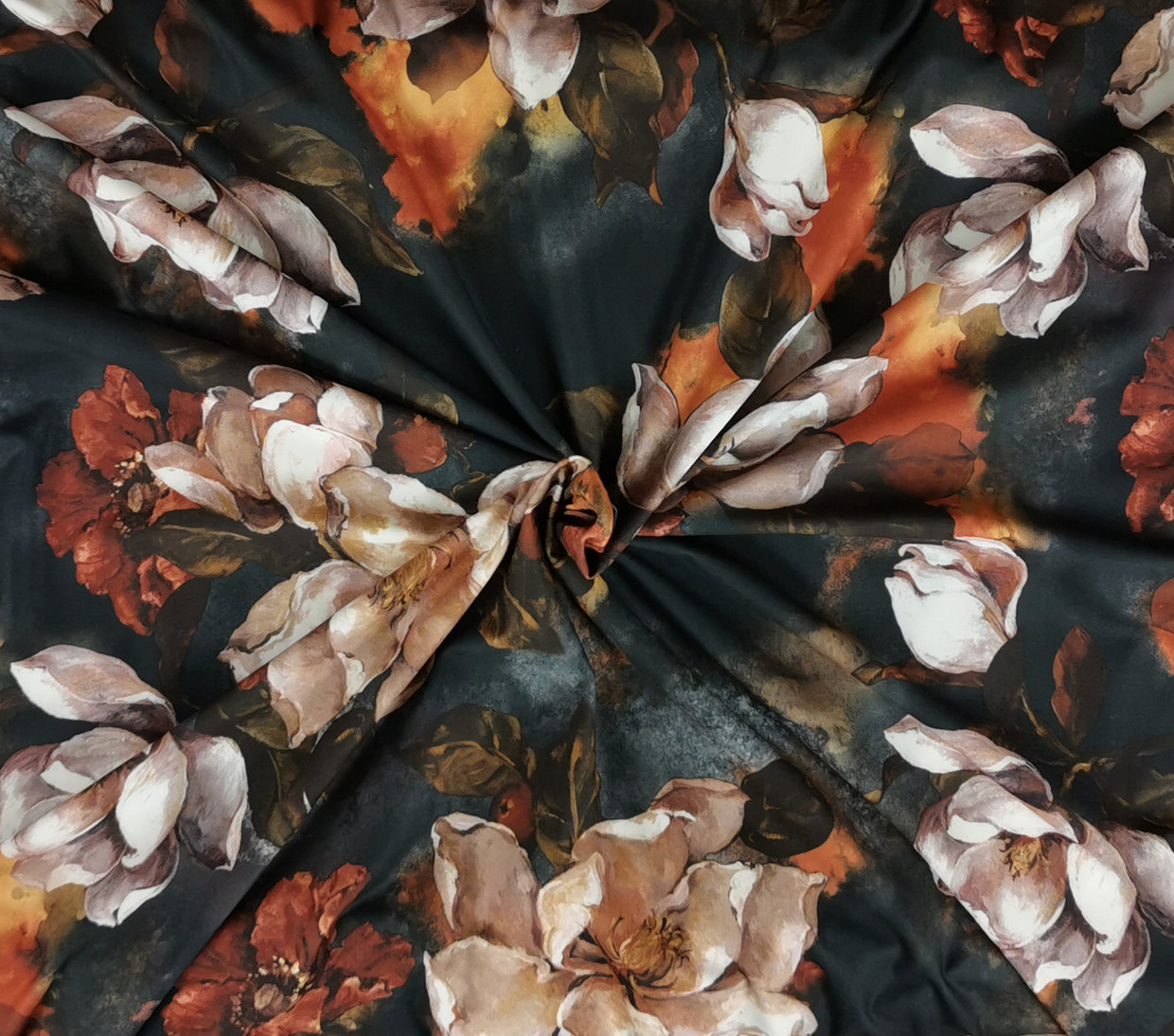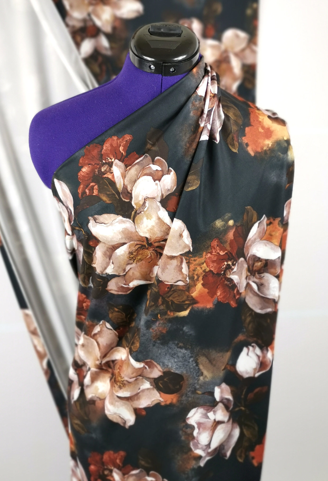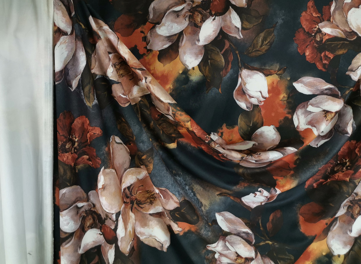 Erittäin pehmeä, pinnaltaan hieman mokkamainen ohut trikoo todella vaikuttavalla, maalausmaisella kukkakuviolla. Näyttävät isot kukat tekevät upean vaikutelman!